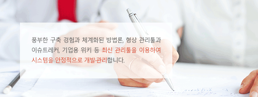 풍부한 구축 경험과 체계화된 방법론, 형상 관리툴과 이슈트레커, 기업용 위키 등 최신 관리툴을 이용하여 시스템을 안정적으로 개발·관리합니다.